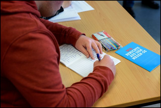 Tief beeindruckend sind oft jene ersten Minuten des Schreibens, in denen eine ganze Workshop-Gruppe in den Flow kommt: die Köpfe nach vorne geneigt, die Blicke auf die Hefte gerichtet; auf die eben noch unberührten Seiten fließen erste Worte; anfängliches Zaudern verebbt, der Geräuschpegel sinkt auf ein Minimum; ein Anfang ist gemacht. Nun geht es Satz um Satz tiefer in die Geschichte. In der Ich-Form erzählen die Schreibenden so aus ihrem Leben. Was in diesen Minuten passiert, lässt sich mit einer Passage aus dem Tagebuch 1946–1949 von Max Frisch treffend illustrieren: „Man hält die Feder hin, wie eine Nadel in der Erdbebenwarte, und eigentlich sind nicht wir es, die schreiben; sondern wir werden geschrieben. Schreiben heißt: sich selber lesen.“