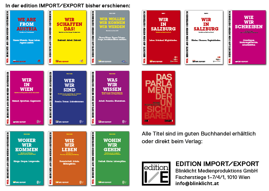 Die Schreib-Workshops des Blinklicht Media Lab werden seit 2011 in Schulen (mittlerweile in fast allen Typen) sowie in zahlreichen anderen Bildungsinstitutionen (anfangs vor allem in Produktionsschulen, seit einiger Zeit auch etwa in Volkshochschulen und im Jugendcollege der Stadt Wien) angeboten. Jahr für Jahr entstehen dabei im Schnitt rund 500 BERICHTE AUS DEM NEUEN OE. Daraus sind bisher elf Bücher geworden, allesamt erschienen in der edition IMPORT/EXPORT.
