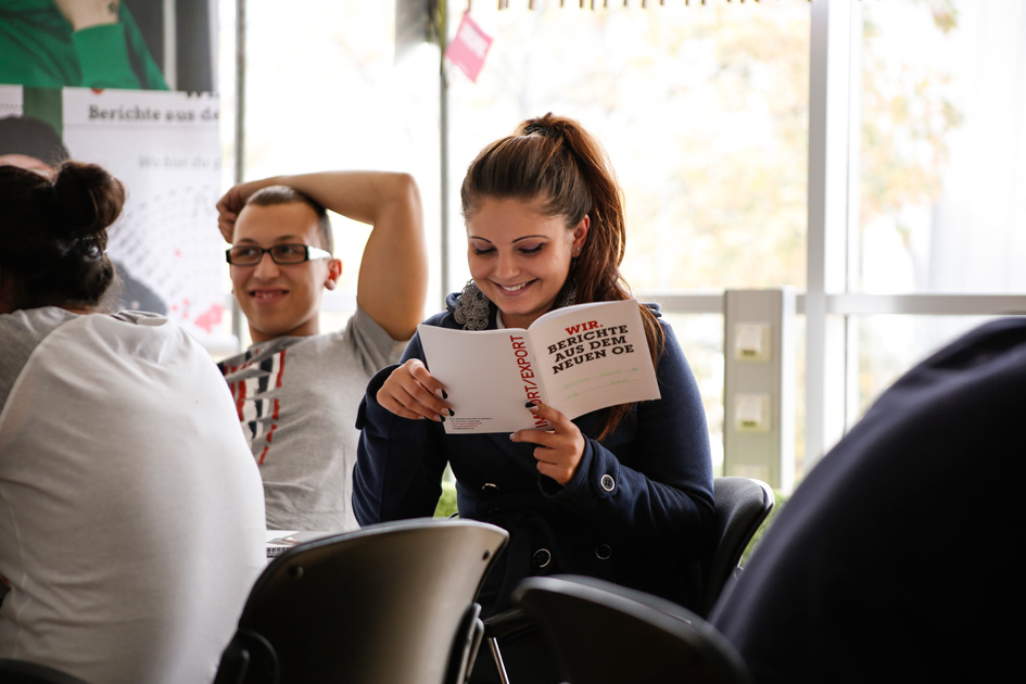 Auf den Bildern, die wir der Fotografin Truc Phan verdanken, ist die 2BL bei der Arbeit zu sehen – und zwar im Medienzentrum MUMELZ der BHAK 22, einer neuen und ausgesprochen schönen Schule in der Wiener Donaustadt.