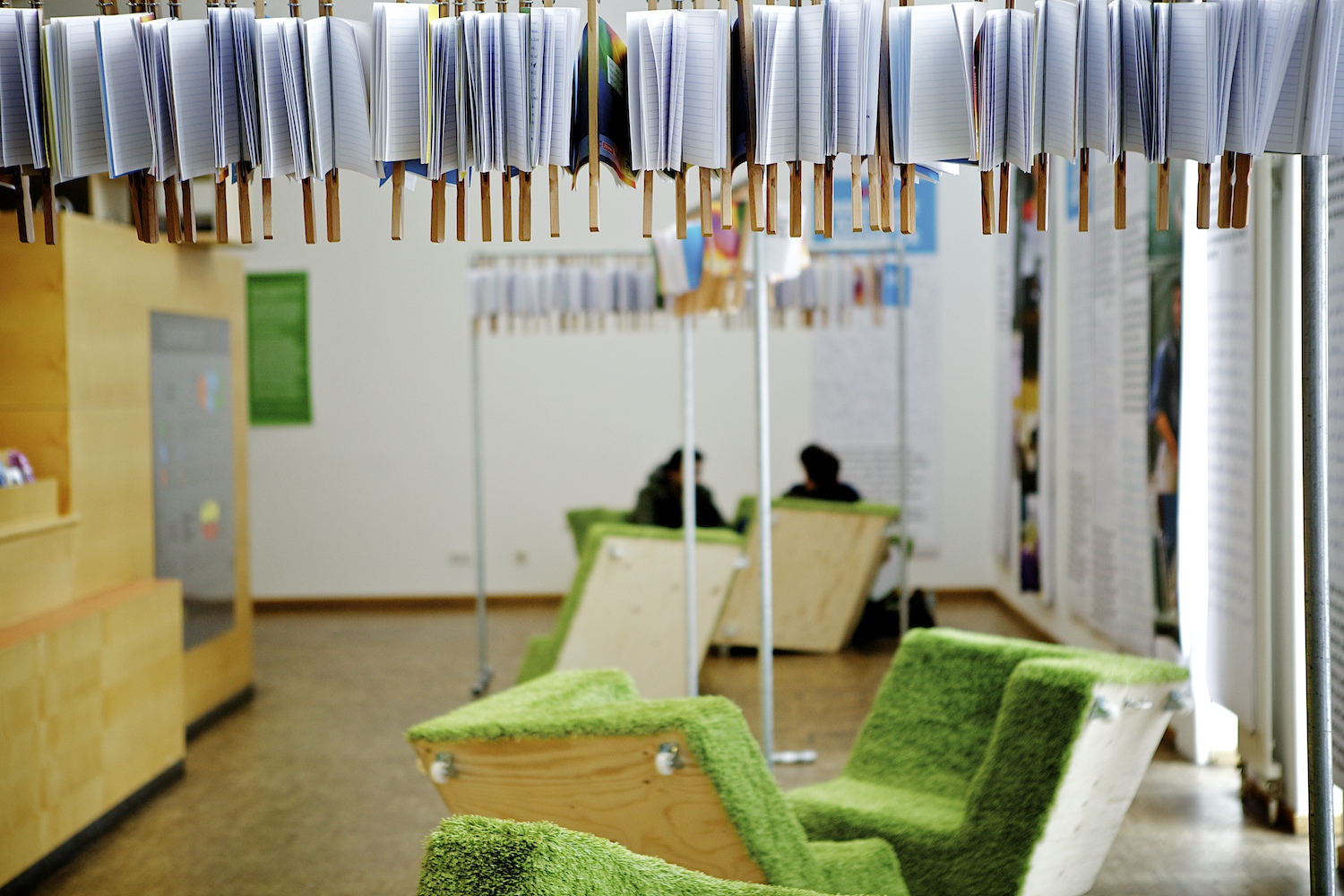 Im Gehen durch die Räume standen wir plötzlich vor einer Hakenreihe, an der auf Bügeln, wie Miniatur-Kaffeehauszeitungen, bunt gebundene Schulhefte im A5-Format hingen. Christian Jahl erklärte mir, das sei ein Projekt des Wiener Journalisten Ernst Schmiederer und seines Medialabs ‚Blinklicht’. Es heiße „Wir. Berichte aus dem neuen OE (also Österreich)“ und bestehe darin, dass Jugendlichen die Möglichkeit gegeben werde, sich selbst darzustellen, ihre Herkunft, ihre Familie, ihre Pläne und ihre Nöte. Die Jugendlichen würden aufgefordert, in ein Heft zu schreiben. Zirka 1500 hätten es schon getan, manche über zwei Seiten, manche über zehn.“