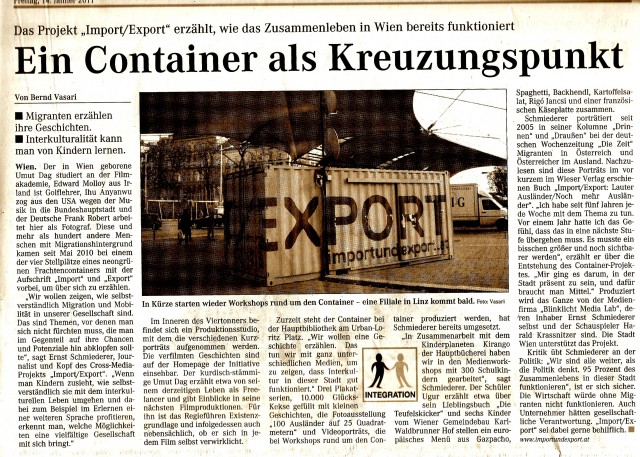 IMPORT/EXPORT „erzählt, wie das Zusammenleben in Wien bereits funktioniert“, schreibt die „Wiener Zeitung“ in ihrer Ausgabe vom 14. Jänner 2011 unter dem Titel „Ein Container als Kreuzungspunkt“. Und: „Interkulturalität kann man von Kindern lernen.“ Bleibt uns zweierlei: Erstens: Ja, das stimmt. Und zweitens: Dank an Bernd Vasari, den Autor der Geschichte, und an Stefan Beig, der das Ressort „Integration“ in der Wiener Zeitung leitet.