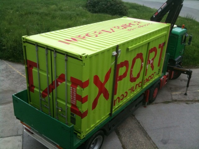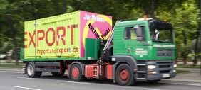 Es ist vollbracht: Der IMPORT⁄EXPORT-Bautrupp um Peter Fattinger hat das gute Stück plangemäß am 10. Mai um 15.00 Uhr auf den LKW gewuchtet. Dem Auszug aus Simmering steht nichts mehr im Wege; auf zum Rathaus.