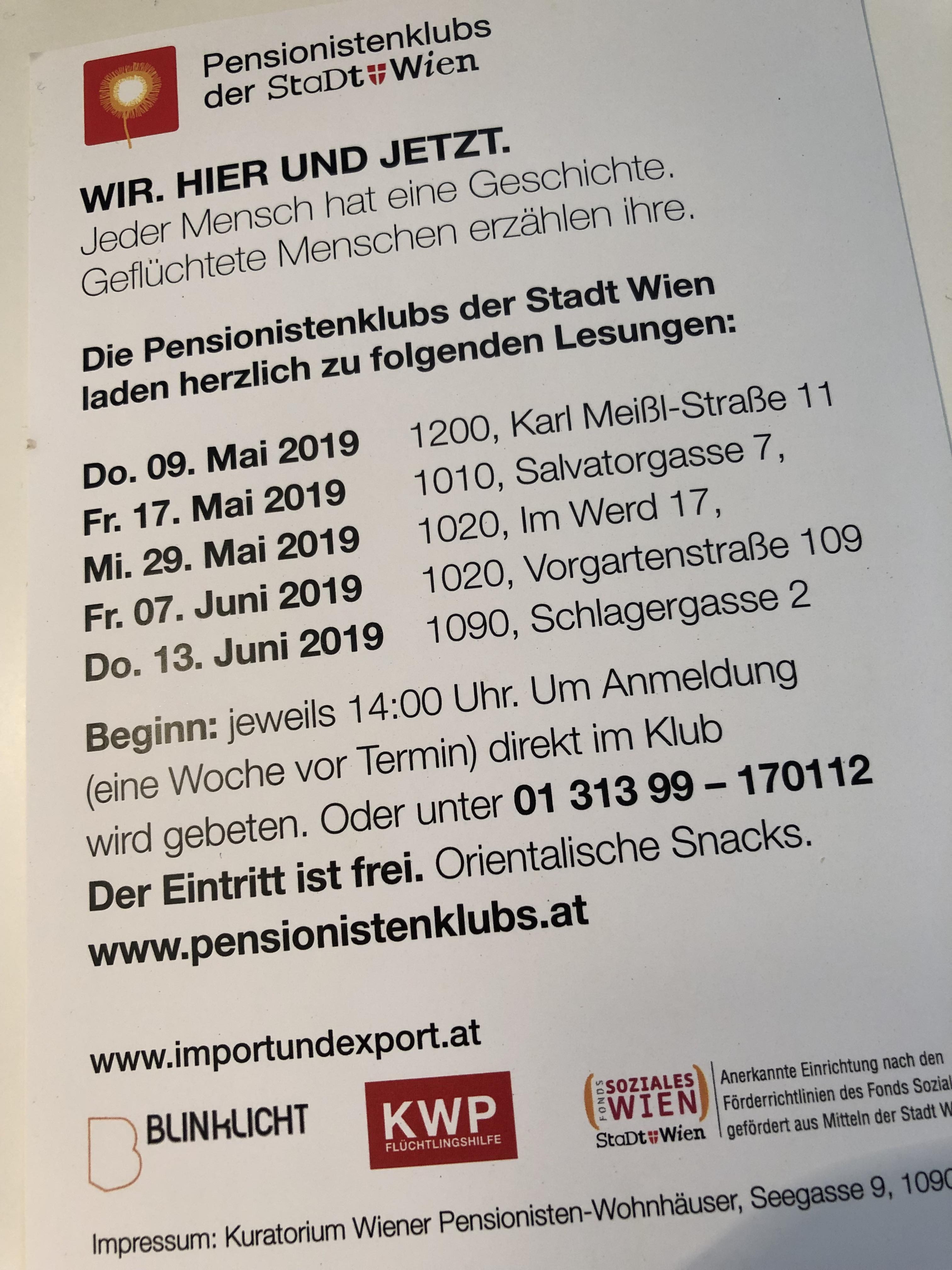 Es ist uns eine Ehre: die Pensionistenklubs der Stadt Wien laden herzlich zu Lesungen aus unseren beiden Büchern WIR. HIER UND JETZT: Geflüchtete Menschen berichten. Fünf Lesungen gibt es im Mai und Juni 2019, weitere werden im Herbst wohl folgen. Wir bringen junge Menschen, Geschichten und Bücher mit. Die Damen und Herren in den Klubs steuern Neugier, Aufmerksamkeit und gute Laune bei. Und die Mitarbeiter*innen in den Klubs (herzlichen Dank!) sorgen für eine angenehme Atmosphäre und großzügige Bewirtung.