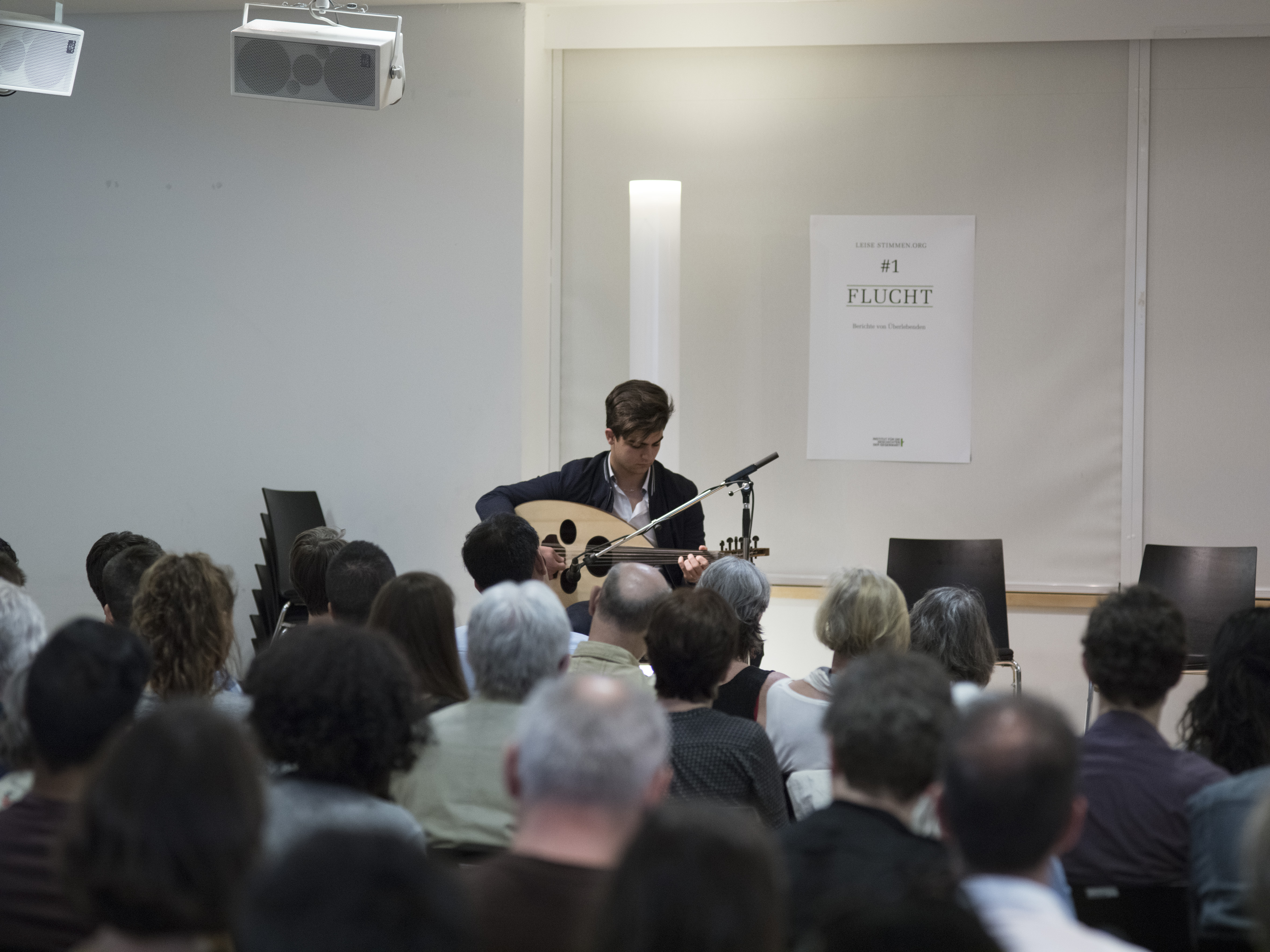 Und bei Harald Krassnitzer, der Mazen Dakwars Geschichte erzählt hat. Bei Laura Schoch, Christine Okresek und bei Faiz Rasuli, der für Anahita Tasharofis Verein Flucht nach Vorn eingesprungen ist. Bei Mojtaba Tavakoli, der heute 23 Jahre alt ist und erzählt hat, wie er die Welt als 14jähriger gesehen hat. Bei Khaled Al-Ass, der mit seiner Familie über das Mittelmeer geflüchtet ist und an diesem Abend mit einer Riesenschüssel Tabouleh und seinen beiden Begleiterinnen Nancy Lee Akinci Seymann und Heidi Bauer aus dem Weinviertel zu uns gekommen ist. Bei Karwan Zandi, der mit Datteln, Humus, Tsaziki, Melanzani, Börek und Falafel in die Hauptbücherei gekommen ist. Und schließlich bei Masad Thani, der uns auf Vermittlung von seinem Lehrer Marwan Abado mit der Oud begleitet hat: herzlichen Dank an beide Herren!